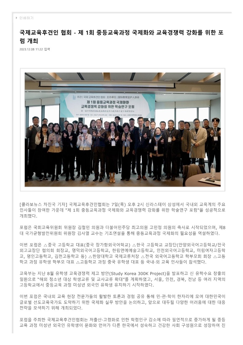 국제교육후견인협회 - 제 1회 중등교육과정 국제화와 교육경쟁력 강화를 위한 포럼 개최_23.12