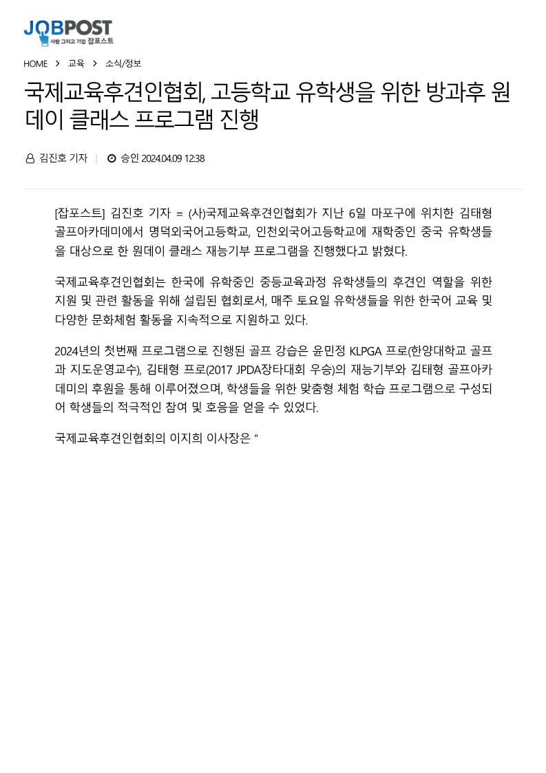 국제교육후견인협회, 고등학교 유학생을 위한 방과후 원데이 클래스 프로그램 진행_24.4