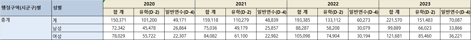 상기 자료는 법무부의 출입국자및체류외국인통계중 일반적으로 유학생에 해당하는 D-2, D-4 체류자격에 해당하는 통계자료를 발췌하여 가공한 자료이며, 이 자료를 통해 2020년부터 2023년까지의 외국인 유학생의 수치적 증감을 간접적으로 확인할 수 있다.