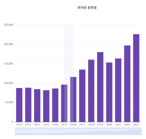 2020~2021년을 지나 2022년부터 다시 증가하는 추세가 확인되며, 2023년 기준 약 22만명의 외국인 유학생 유치 현황을 통해 교육부에서 발표했던 ‘Study Korea 300K Project’의 목표에 근접해가고 있는 모습을 확인할 수 있다.