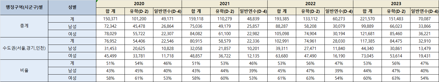 현재 국내 인구의 수도권 과밀화 현상과 지역 불균형 현상이 외국인 유학생들에게도 거의 유사한 흐름으로 나타나는 경향을 보이고 있다. 국내 인구 기준 일반적으로 수도권으로 분류되는 지역(서울, 인천, 경기)이 전체 인구 대비 약 51%를 차지하고 있으며(2023년 기준), 외국인 유학생 또한 수도권에 약 53%가 집중되고 있는 현상을 보이고 있다. 이러한 양상은 일시적인 현상이 아닐 뿐 아니라, 비율상으로 소폭이지만 오히려 증가하고 있는 추세를 보이고 있다. 수도권 과밀화와 지방 소멸 현상에 대한 주요 대안으로 유학생 유치 사업이 주목을 받고 있는 가운데, 국가 차원의 장기적인 균형 발전을 위해서 이러한 현상을 해소하기 위한 심층적인 원인 파악과 대안 등에 대한 적극적인 연구가 필요할 것으로 전망된다.