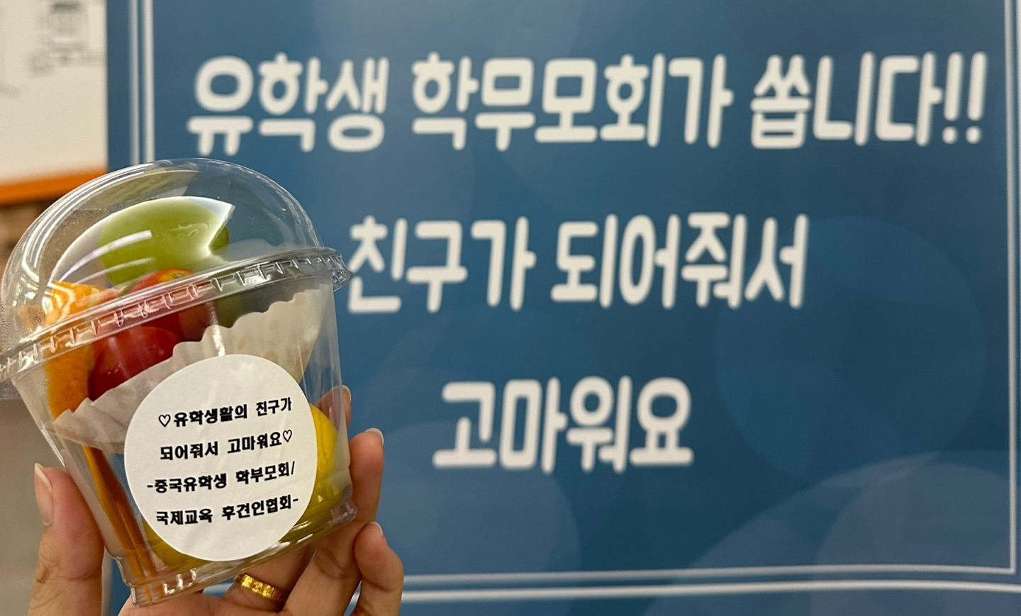 2024年韩国高中运动会上,全校700名学生和老师收到了我们准备的水果杯以示助威,并且水果杯受得了很多的欢迎。全校师生们纷纷表示感谢,并希望将他们的谢意传达给中国家长会和所有中国留学生。