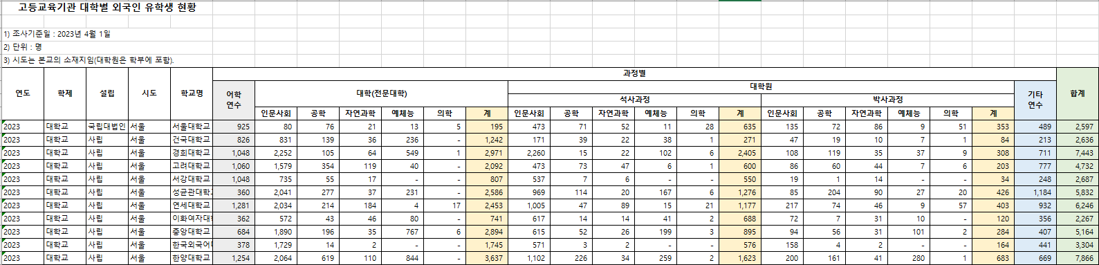 2023학년도 서울 상위권 11개 대학 외국인 유학생 현황
